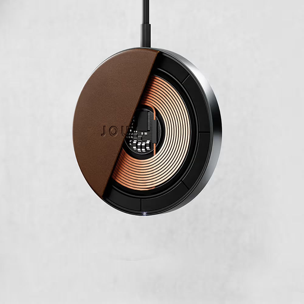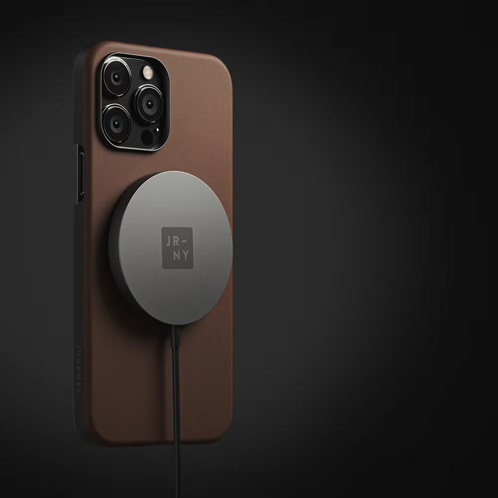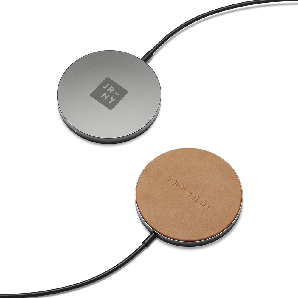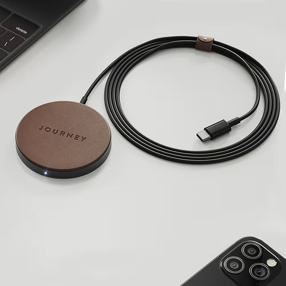 MagSafe compatible wireless charger with strong magnets and a luxurious design. Crafted with premium full grain European leather and aluminium, its perfect for your bedside table or desk.