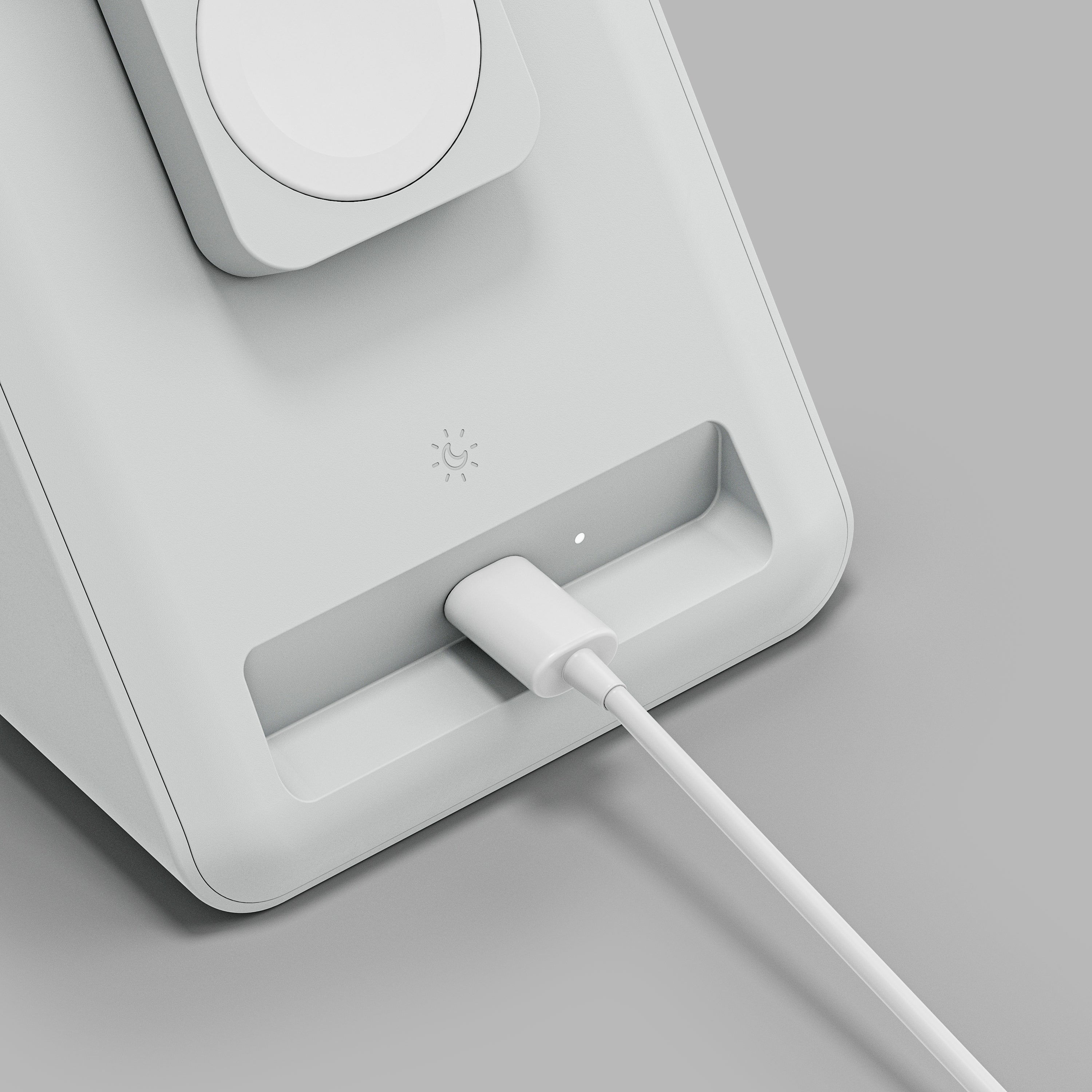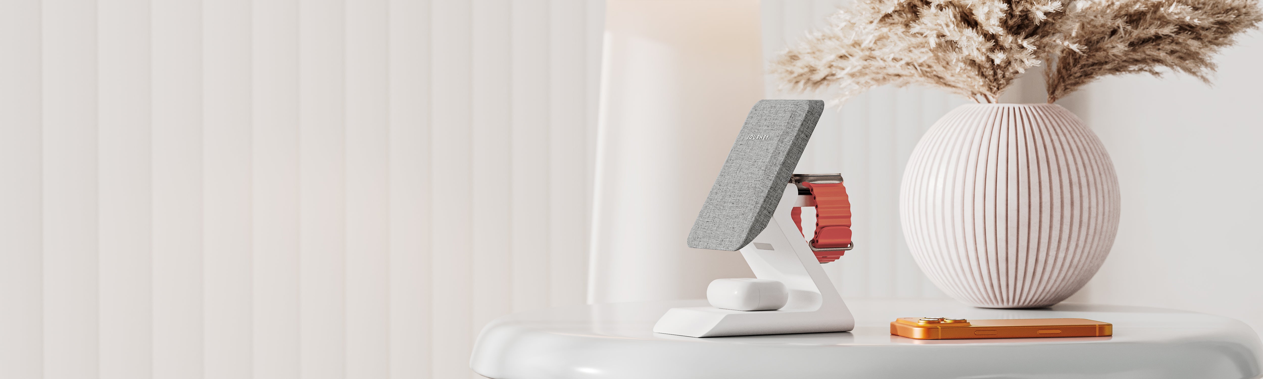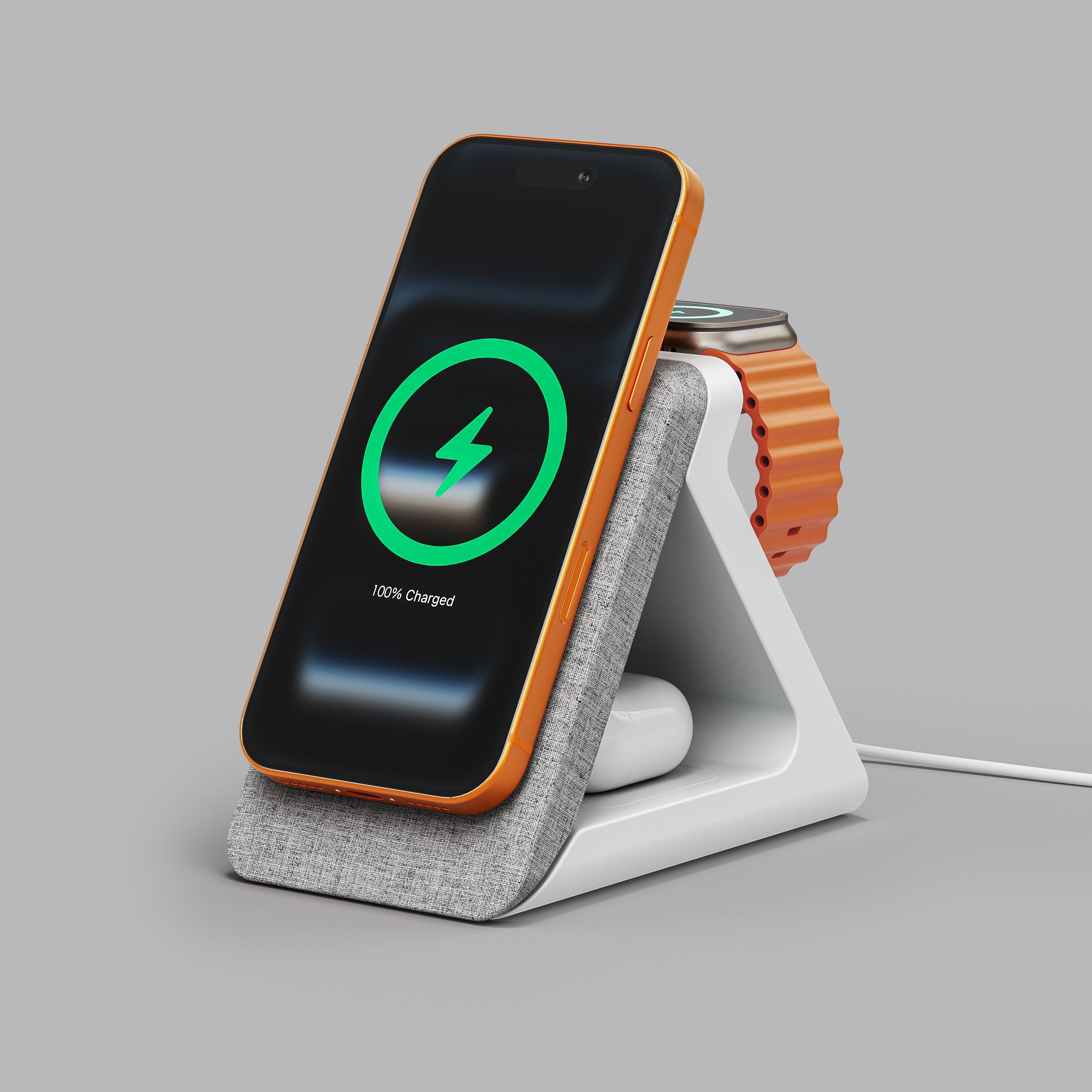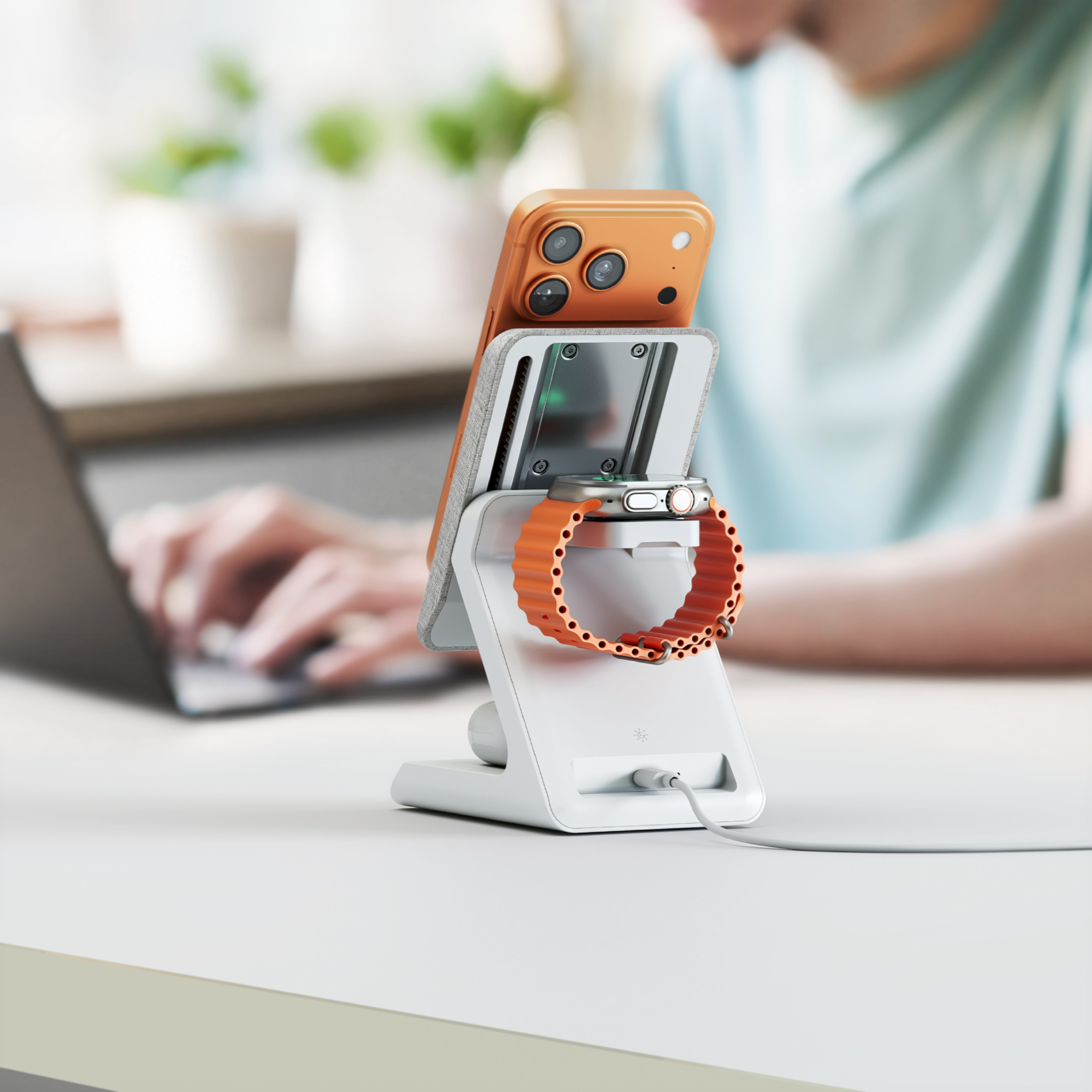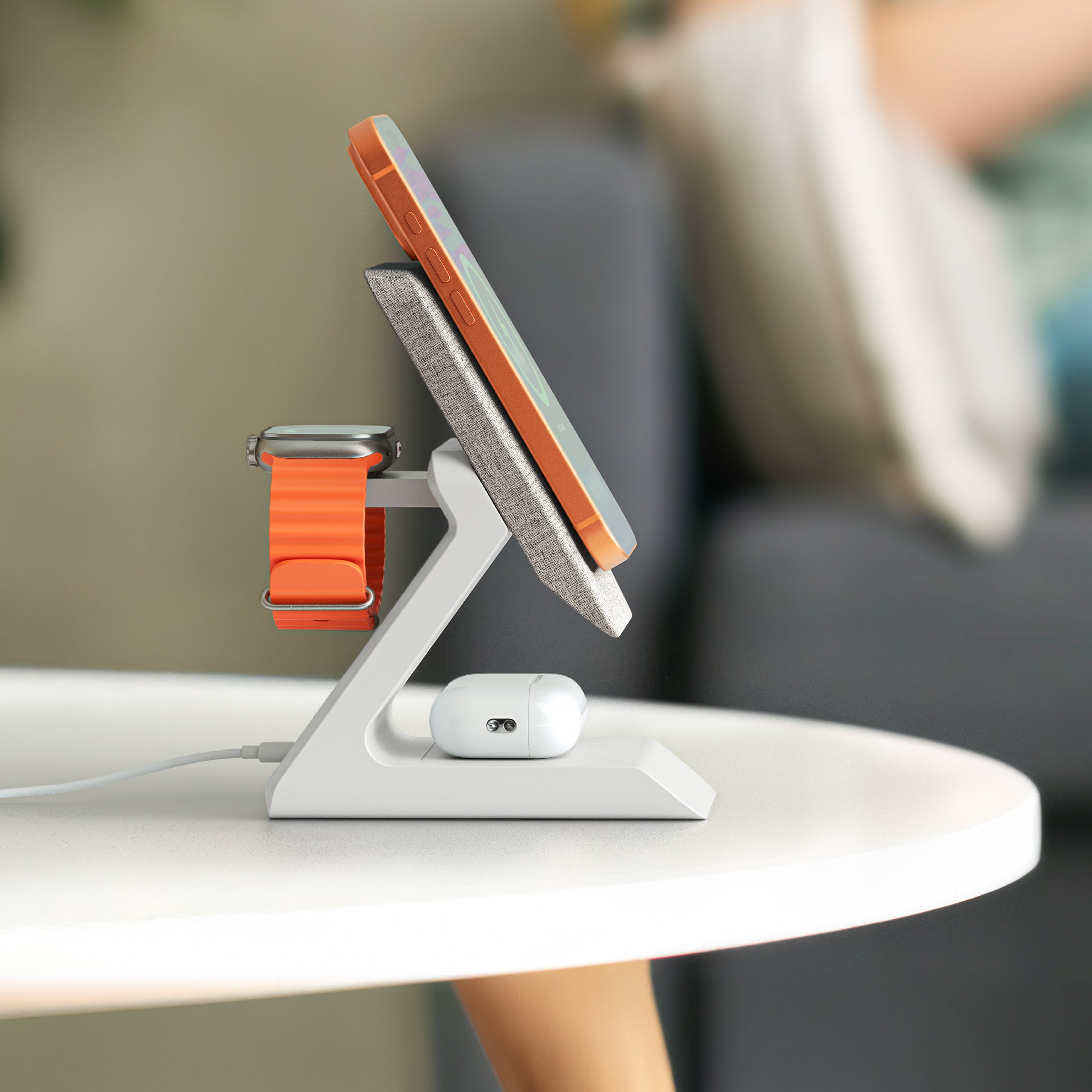 It supports MagSafe-compatible iPhones, all Apple Watch models, and wireless-charging AirPods.
